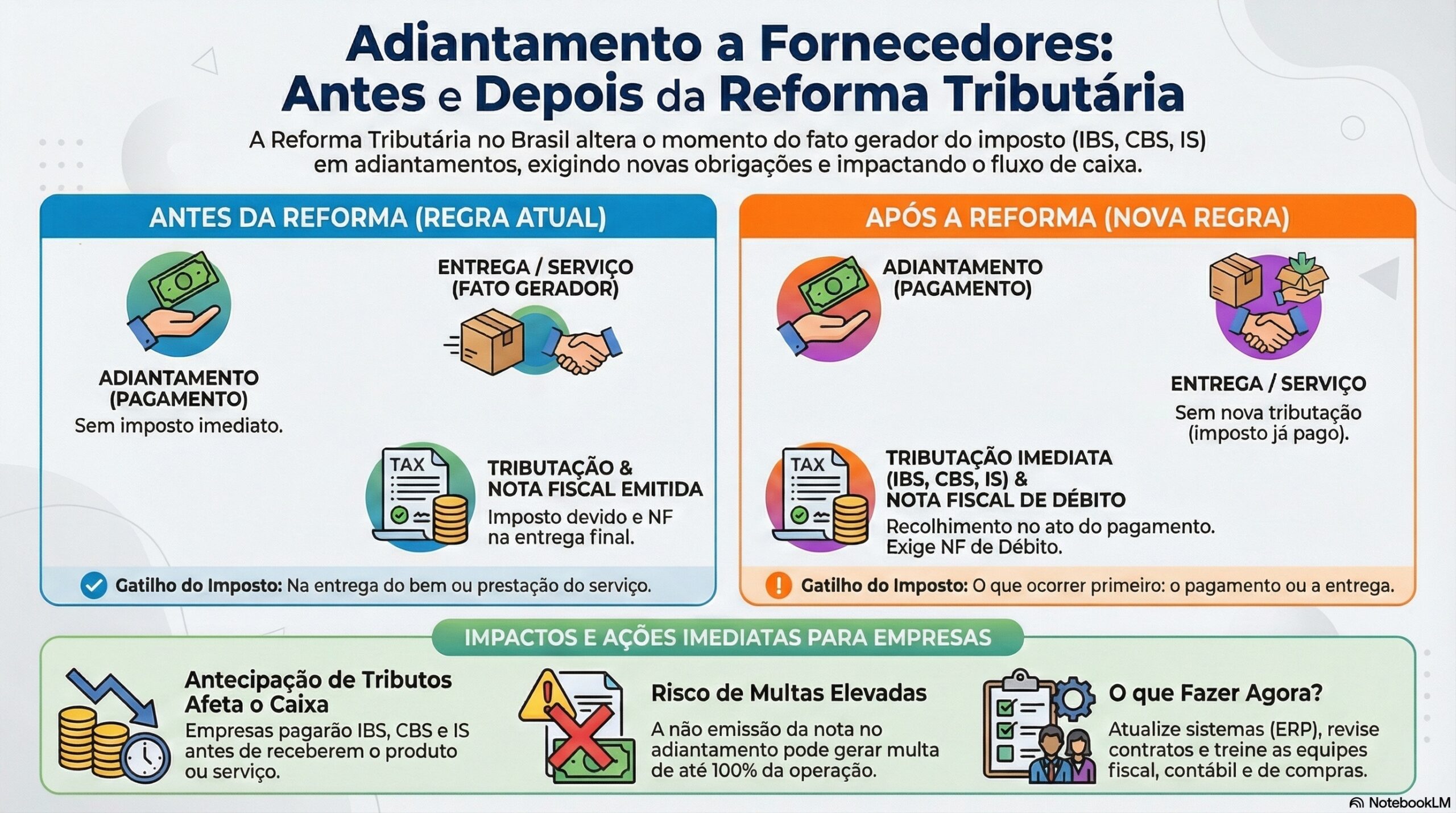 | Tributação no Adiantamento | Não havia tributação imediata. | Os tributos (IBS, CBS, IS) devem ser recolhidos no ato do pagamento. |